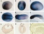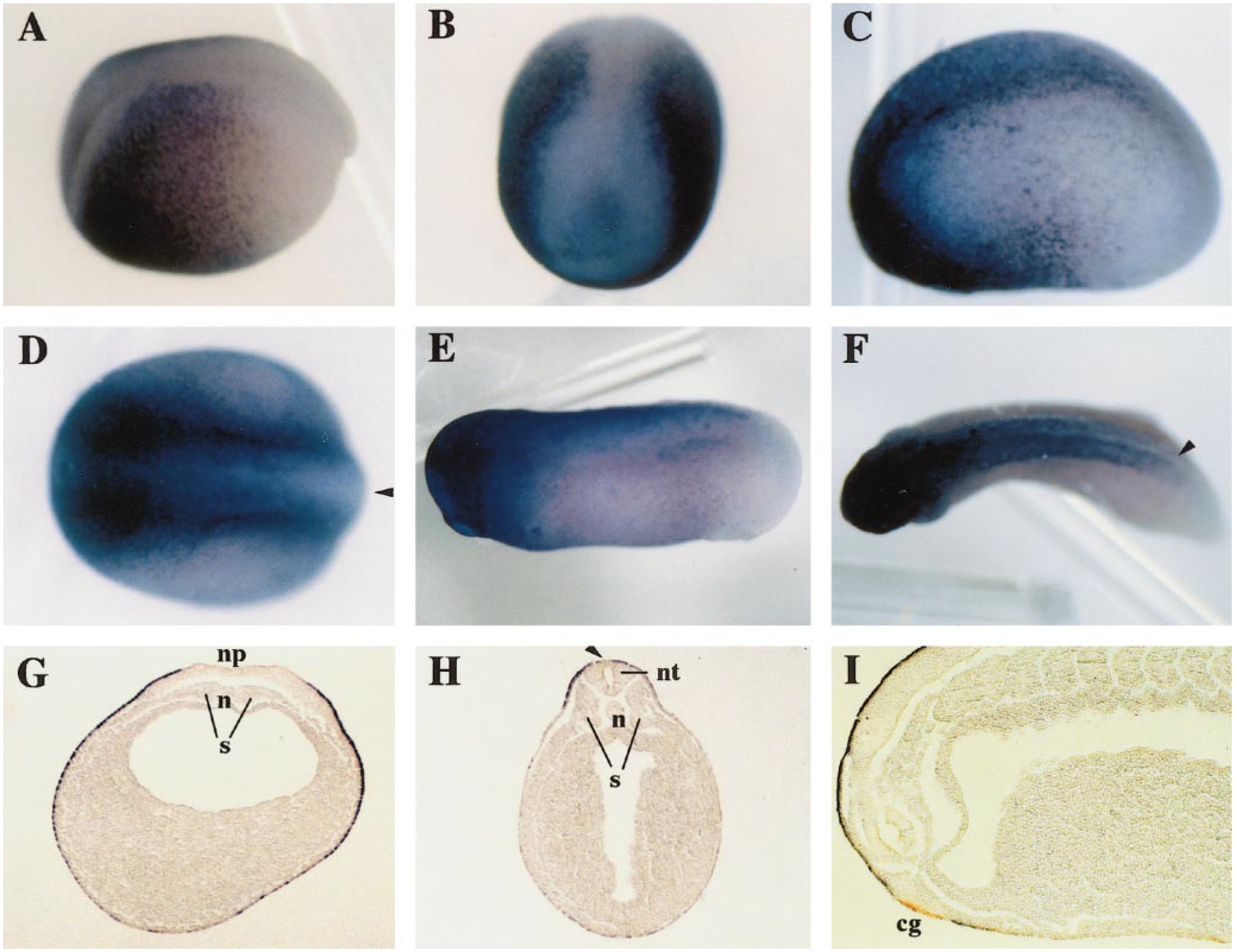 FIG. 3. Localization of Xepsin transcript in normal embryos, analyzed by whole-mount in situ hybridization. Stages are 15 (A, B), 18 (G), 20 (C, D), 22 (H, I), and 27 (E, F). (A, C, E) Lateral view. (B) Anterior view. (D, F) Dorsal view. (G) Sections of embryo after whole-mount in situ hybridization. (H) Transverse section. (I) Parasagittal section. The signal was not detected in the neural plate (np), neural tube (nt), notochord (n), somite (s), or cement gland (cg), and Xepsin expression was also absent from the midline of the most dorsal region of the epidermis (black arrowhead) (D, F, H).