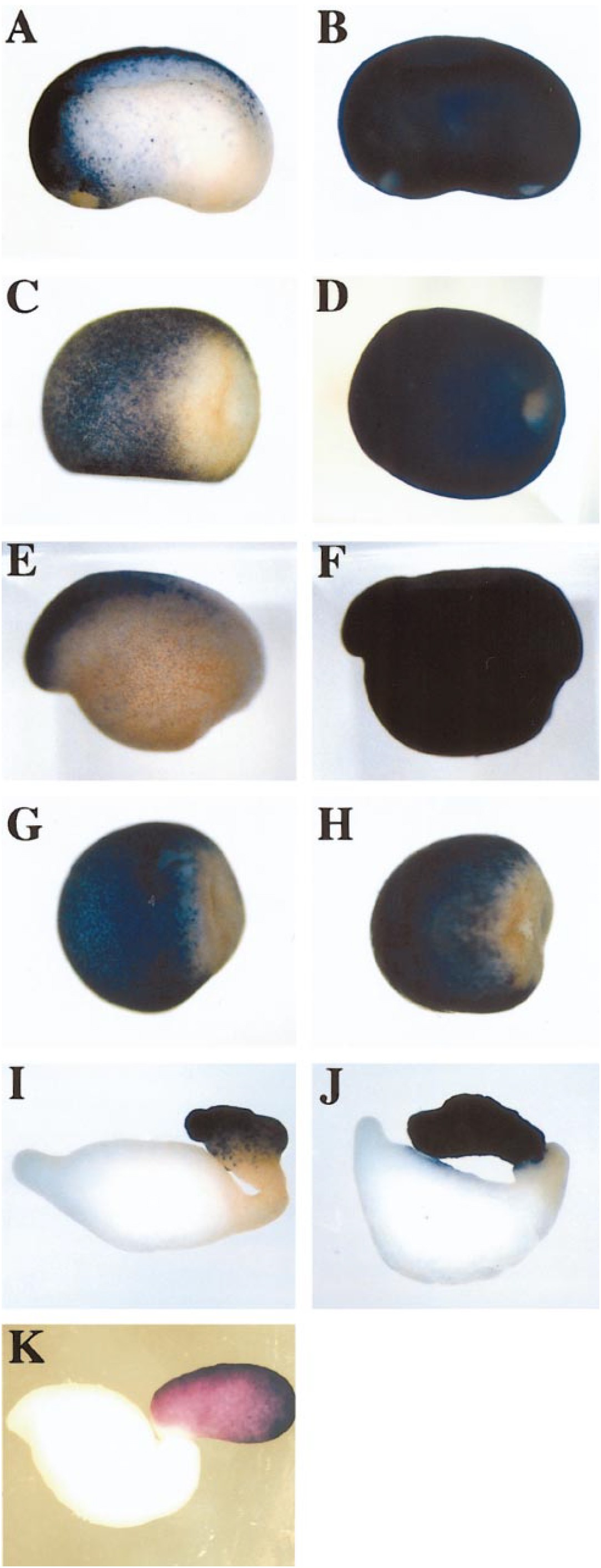 FIG. 4. Expression of Xepsin (A, C, E, G, I, K) and epidermal keratin (B, D, F, H, J, K) in axis-perturbed embryos analyzed by whole-mount in situ hybridization. All embryos were allowed to develop until control embryos reached stage 23. (A, B) Normal embryos. (C, D) UV-irradiated embryos (DAI 0). (E, F) UV-irradiated embryos (DAI 1). (G, H) LiCl-treated embryos (DAI 10). (A) Blastopore is to the right. (I, J, K) Exogastrula embryos. Ectodermal half is on the top right. (K) Double in situ hybridization showing Xepsin expression (purple) in the more anteriorly confined domain than keratin (pink).
