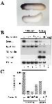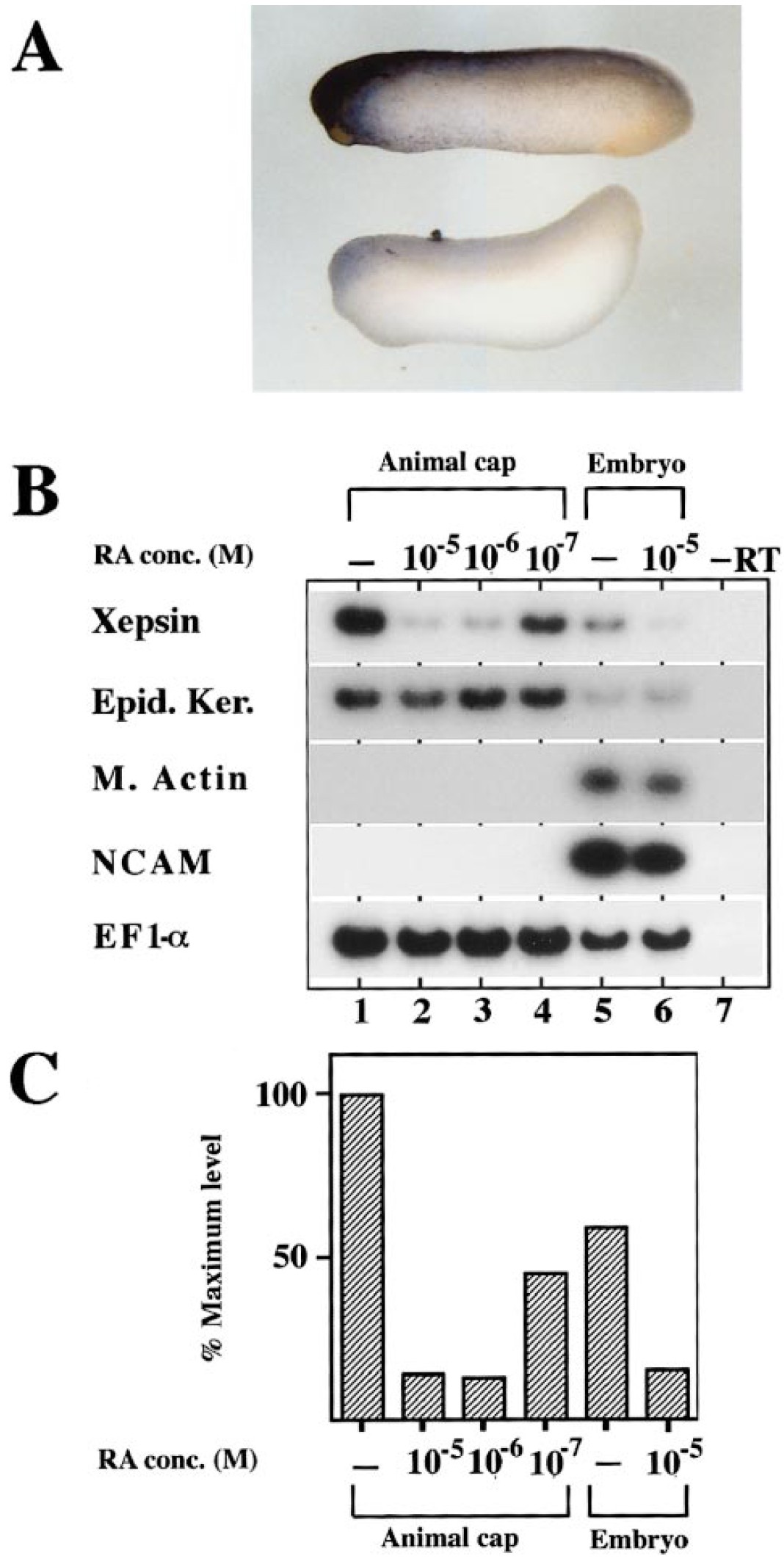 FIG. 6. Xepsin mRNA expression is suppressed by exogenous RA. (A) Analysis of Xepsin mRNA expression in RA-treated whole embryos. Embryos were treated with 1026 M all-trans-RA for 1.5 h at the early gastrula stage, cultured until the tailbud stage, and processed for whole-mount in situ hybridization with the Xepsin antisense probe. (Top) Untreated sibling control embryo. (Bottom) RA-treated embryo. Anterior is left. (B) RT-PCR analysis of Xepsin expression in whole embryos or explants after RA treatment. Animal caps were isolated from early gastrula embryos and cultured with different concentrations of RA until siblings reached stage 20. (Lane 1) Control caps; (lane 2) 1025M RA-treated caps; (lane 3) 1026M RA-treated caps; (lane 4) 1027M RA-treated caps. Embryo was treated either with (lane 6) or without (lane 5) 1025 MRA until control embryos reached stage 20. Note that NCAM and muscle actin are not expressed in these animal caps. (Lane 7) cDNA preparation except for reverse transcriptase. Total RNAs from one animal cap equivalent or one-fifth equivalent of one embryo were used as template to generate first-strand cDNA. (C) Radioactivity levels of each Xepsin band in B was measured with a laser image analyzer. The Xepsin expression, normalized by the EF1-a, is presented as a histogram. One-hundred percent expression of Xepsin was defined as the level seen in control caps.