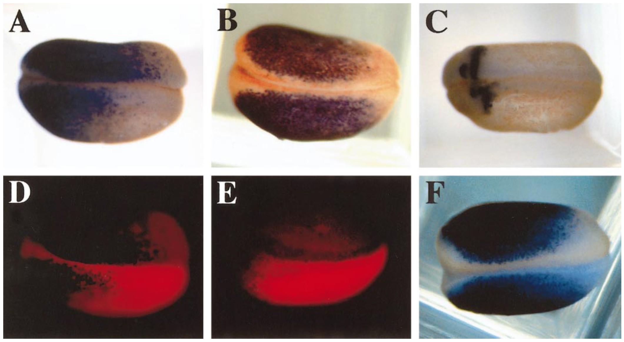 FIG. 7. Expression of Xepsin in embryos expressing unilaterally constitutively active xRARa1 (A), dominant negative xRARa1 (B), and in a control embryo (F). (C) Expression of Krox-20 in a dominant negative xRARa1-expressing embryo (C). All embryos were analyzed at stage 17 by whole-mount in situ hybridization. TRDX was used as a lineage marker, showing the injected side. (D) The TRDX luminescence image of A after in situ hybridization. (E) The TRDX luminescence image of B before in situ hybridization. All embryos are shown in dorsal views with the anterior to the left. (A) The injected side is on the bottom.