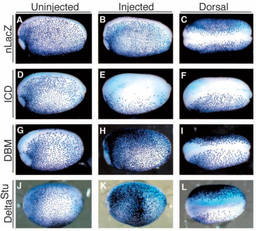 and nLacZ RNAs, or (J-L) X-Delta-1Stu and nLacZ RNAs. At stage 17-18