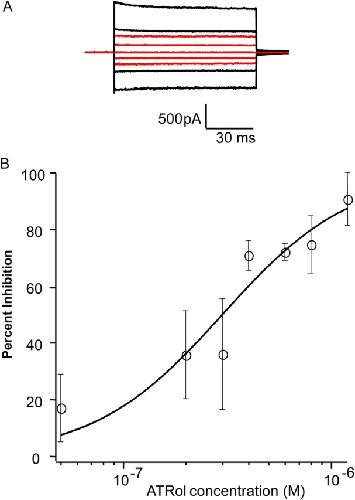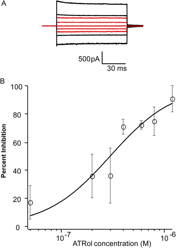 Figure 4. ATRol is a potent inhibitor of the homomeric rod CNG channel. (A) The raw traces represent families of cGMP-activated currents in response to voltage steps ranging from −100 to +100 mV in 50-mV increments from a holding potential of 0 mV. Currents measured in the absence of cGMP were subtracted from all traces. Black traces represent currents in saturating cGMP (2 mM) before the addition of ATRol; red traces represent currents after 1 h (steady state) in 400 nM ATRol (63% inhibition). (B) The dose–response relation for ATRol inhibition of the rod CNG channel. All points were measured at +100 mV after 1 h (steady state) in the indicated concentration of ATRol and saturating (2 mM) cGMP. Data were normalized to maximal current in 2 mM cGMP in the absence of ATRol, with leak current in the absence of cGMP subtracted from each. Each point is an average from two to four patches, and the smooth curve is a fit with the Hill equation, where the IC50 = 300 nM, and n = 1.4.