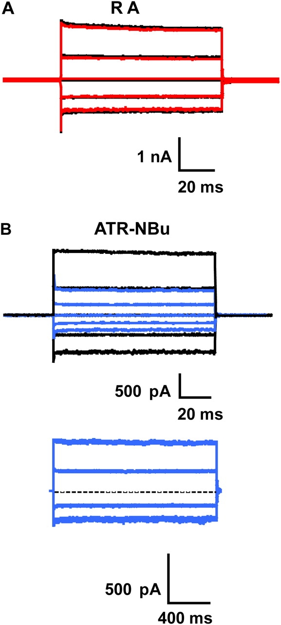 Figure 5. RA does not inhibit the homomeric rod CNG channel; ATR-NBu does inhibit, but not in a voltage-dependent way. Currents were measured from multichannel, inside-out patches of homomeric (CNGA1) rod channels at saturating (2 mM) cGMP. The raw traces in A and B (top) represent families of cGMP-activated currents in response to voltage steps ranging from −100 to +100 mV in 50-mV increments from a holding potential of 0 mV. Currents measured in the absence of cGMP were subtracted from all traces. The traces in B (bottom) represent cGMP-activated currents in response to longer (1.5 s) voltage pulses to +100, +50, −50, or −100 mV from 0 mV after inhibition in 80 nM ATR-NBu reached steady state. The dashed line represents the baseline (i.e., zero current). The holding potential was 0 mV during the application of ATR-NBu. Black traces represent currents in saturating cGMP prior to the addition of RA or ATR-NBu; red or blue traces represent currents after 1 h in RA or ATR-NBu, respectively. (A) 400 nM RA gave no inhibition (red); similar results were seen in two other patches. (B, top) 80 nM ATR-NBu conferred 60% inhibition (blue); (bottom) 1.5-s voltage pulses on the same patch as in the top panel after 1 h in 80 nM ATR-NBu do not show any voltage dependence of ATR-NBu inhibition.