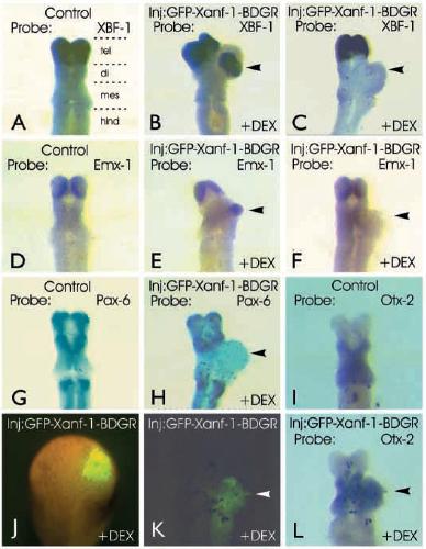 in the control embryo is revealed by XAG-1 probe. (J) Activation of GFP-Xanf-1-BDGR in embryos microinjected with the mixture of Otx-2