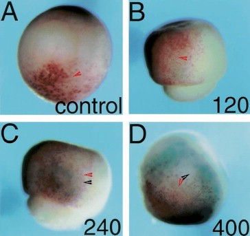 Fig. 3. Spatial response of Xwnt-8 to changes in the levels of BMP-4. Embryos co-injected with LacZ RNA for lineage tracing and increasing amounts of BMP-4 mRNA and dorsalized by full LiCl treatment. At stage 11 the embryos were stained for b-galactosidase activity (red) and the expression of Xwnt-8 determined by in situ hybridization (blue). (A) Control embryo injected only with LacZ mRNA showing the loss of Xwnt-8 as a result of the dorsalization. (B) Injection of 120 pg of BMP-4 RNA results in very low levels of expression of Xwnt-8 at the site of injection. (C) BMP-4 mRNA injected at intermediate levels (240 pg) activates expression of Xwnt-8 at the site of injection. (D) High levels of BMP-4 RNA injected (400 pg) result in the inhibition of Xwnt-8 expression at the site of injection while Xwnt-8 is activated in bordering regions. The red arrowhead marks the site of injection tracer b-galactosidase activity; the black arrowhead points to the Xwnt-8 expression signal.