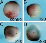 Fig. 5. Expression of sizzled is regulated by BMP-4. Embryos were injected with dominant negative BMP receptor capped RNA or different amounts of BMP-4 mRNA. Expression of the sizzled gene was studied in the treated embryos at stage 11.5 by in situ hybridization. (A) Control embryo exhibiting the normal sizzled expression pattern. (B) Overexpression of the dominant negative BMP receptor which blocks BMP signaling results in a reduction in sizzled expression. (C) Injection of BMP-4 mRNA (0.8 ng) results in the dorsal expansion of sizzled expression. (D) Injection of higher amounts of BMP-4 RNA results in a wide expansion of sizzled expression along the marginal zone.