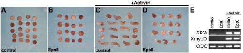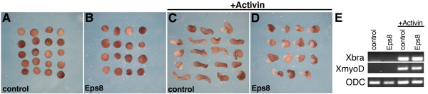 Figure 8. Eps8 blocks elongation of activin treated animal caps. (A,B) Control and Eps8-injected animal cap explants remain rounded in the absence of activin. (C,D) Control explants elongate extensively in the presence of activin, whereas Eps8 expression inhibits elongation. (E) RT-PCR analysis shows that Eps8 expression does not block activin-mediated induction of the mesodermal markers Xbra and MyoD. ODC is a control for mRNA isolation, reverse transcription, and gel loading.