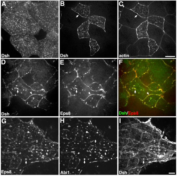 Figure 6. Dsh is recruited to the plasma membrane and actin filaments in response to Eps8 expression. Distribution of Dsh-GFP (A,B,D, green in F), actin (C), Eps8-myc (E,G, red in F), Abi1-GFP (H), and Dsh-flag (I) in Xenopus animal cap cells. (A) Localization of Dsh-GFP in control animal caps. (B,C) In response to Eps8 expression, Dsh is recruited to the membrane and cell-cell junctions in superficial epithelial cells where it co-localizes with actin (arrows). (D-F) In deep cells facing the blastocoel, Eps8 induced the recruitment of Dsh to cytoplasmic actin cables and the cell cortex where Dsh co-localized with Eps8 (co-localization appears yellow). (G-I) Co-localization of Eps8, Abi1, and Dsh in animal caps cells (arrows mark site of co-localization). Scale bars are equal to 10 μm.