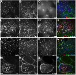 Figure 5. Regulation of Eps8/Abi1-induced actin remodeling in Xenopus. Distribution of Eps8-myc (A,E,I,M; red in D,H,L,P), actin (B,F,J,N; green in D,H,L,P), CP-GFP (C, blue in D), N-WASP-GFP (G, blue in H), FP4-mito-GFP (K, blue in L), and Xvasp-GFP (O, blue in P). (A-D) CP does not block formation of actin stars. (E-H) N-WASP is recruited to Eps8/Abi1-induced actin stars. Actin star formation is not altered in response to inhibition of Ena/VASP activity (I-L) or increased levels of Xvasp (M-P). Scale bar is equal to 10 μm in A-L and 5 μm in M-P.