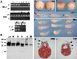 Figure 7. Mis-expression of Eps8 results in gastrulation defects. (A) RT-PCR analysis of the developmental expression of XEps8. ODC serves as a control for RNA isolation and reverse transcription. (B) Western blot probed with anti-XEps8 antibodies show that XEps8 protein is provided maternally and is present in gastrula, neurula, and tailbud stage embryos. (C) Control and (D) Eps8-injected embryos at stage 12. In control embryos the blastopore is well formed and has progressed vegetally (arrowheads). In contrast, Eps8-injected embryos display severe buckling of tissue above the blastopore (arrowheads) and a disorganized blastopore lip that is delayed and malformed. (E) Control stage 37/38 embryos. (F) Eps8-injected embryos show a range of phenotypes including microcephaly, cyclopia, and shortening and arching of the A-P axis. Top = low dose (50 pg); middle = intermediate dose (200 pg); bottom = high dose (1 ng). (G,H) Histological analysis of Eps8-injected embryos shows that Eps8 expression causes a broadening of the notochord (no) and disorganization of the neural tube (nt) and somites (so).
