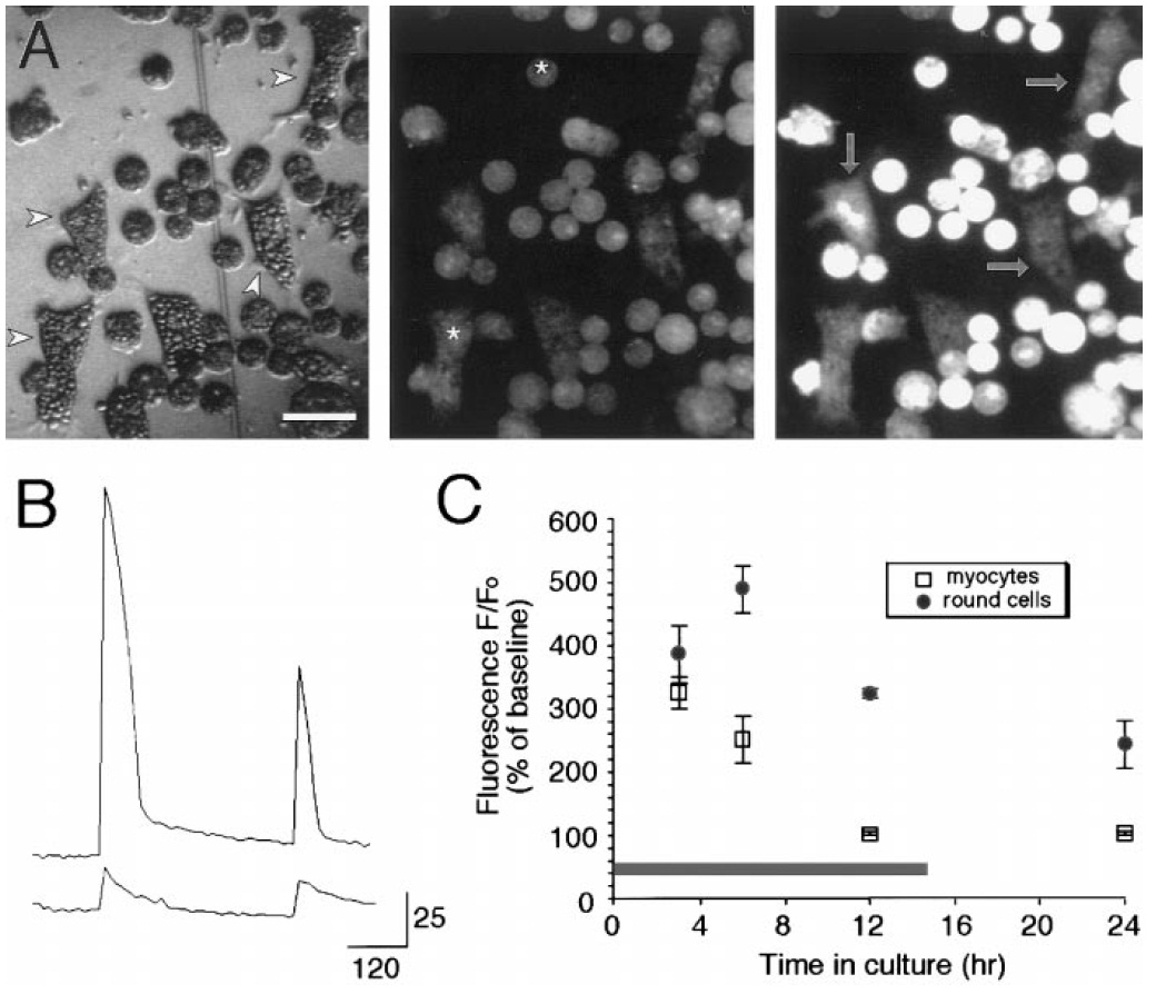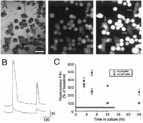 membrane-permeant forms of fluo-3 and caged IP3 at 6 h in culture. (Left) Phase-contrast image of cells; note polarizing myocytes