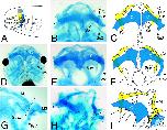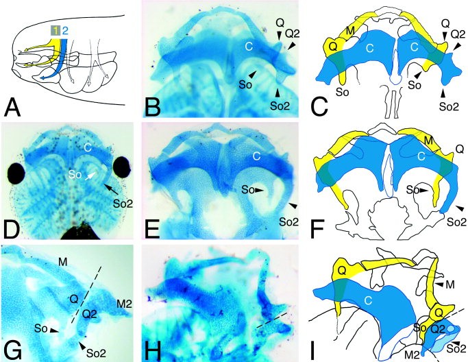 Figure 3. Skeletal alterations of second arch structures in MoHoxa2-injected Xenopus embryos. A: In the drawing, the first arch (1; Hox-negative) and second arch (2; Hoxa2-expressing) streams of migrating NCCs are represented as yellow and blue arrows, respectively (see also Fig. 2). The white arrows indicate the NCC streams migrating in posterior branchial arches. B,D,E,G,H: Alcian Blueâstained skeletal preparations from injected tadpoles at stage 49. The injection side is always on the right. Representative examples of second arch-specific skeletal alterations in Mo2-injected tadpoles, with variable penetrance. B: Mild phenotype in which two ectopic skeletal extensions are present on the lateral margin of the ceratohyalcartilage, one extending anteriorly resembling a duplicated muscular process of the palatoquadratecartilage (Q2), the second one extending posteriorly (So2) evocative of a partial duplication of the caudal extension of the palatoquadrate, the subocular arc (So). Note that, on the injected side, the orthotopic So appears shorter than the So on the non-injected (control) side, possibly reflecting a slight decrease of developmental rate due to the morpholino injection and/or altered signaling between first and second arch territories following Hoxa2 functional knockdown. D,E: The ceratohyal is abnormally connected to the ethmoid-trabecular plate by a supernumerary (So2) subocular arc. D is the whole-mount preparation of the head of the embryo shown in E before dissection of the cartilaginous skeleton. G,H: Severe phenotype showing a mirror-image homeotic transformation in which the ceratohyalcartilage (C) is strongly reduced and replaced by elements resembling a duplicated palatoquadrate structure (Q2) connected posteriorly to a supernumerary subocular arc (So2) and conceivably to a duplicated lateral (proximal) part of the Meckel's cartilage (M2). The broken line represents the axis of symmetry of the mirror-image homeotic duplication. G represents an additional view of the transformation presented in H, after removal of the non-injected ceratohyal and flipping of M, Q, M2, and Q2 cartilages. Legends are as in I. C,F,I: Summary drawings of the malformations observed in B,E,H. First or second arch derivatives display the same color code as in A (yellow or blue, respectively). In F,I, it is assumed that the malformed structures in blue are of second arch origin.Legends are as in B,D,E,G,H.