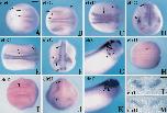 Fig. 1. Developmental patterns of elrC and elrD expressions. Whole mount in situ hybridizations of elrC (A±G) and elrD (H±K). (A) Stage 12, dorsal view: elrC is expressed in longitudinal stripes (arrows), parallel to the anteriorposterior axis, corresponding to primary neurons. (B) Stage 14, dorsal view. The primary neurons (arrows) and the trigeminal placodes (arrowhead) are labeled. Stage 17, dorsal (C) and anterior (D) views: the neural tube (arrow), the trigeminal placodes (arrowhead) and the olfactory placodes (red arrow) are labeled. Stage 20, dorsal (E) and anterior (F) views: in addition to the neural tube (arrow) and the olfactory placodes (red arrow), the developing cranial ganglia (arrowhead) are also labeled. (G) Stage 32, lateral view: elrC transcripts accumulate in the spinal cord, the brain and the cranial ganglia (arrowheads). Stages 17 (H) and 20 (I), dorsal views: elrD expression is detected in the neural tube (arrow). (J) Stage 20, anterior view. The neural tube (arrow), the trigeminal placode (arrowhead) and the olfactory placodes (red arrow) are labeled. (K) Stage 32, lateral view: elrD transcripts are found in the spinal cord, the brain and the cranial ganglia (arrowheads). In all dorsal views anterior is to the right. After whole mount in situ hybridization of elrC (L) or elrD (M), stage 18 embryos were sectioned. Expression of elrC and elrD in the neural tube are similar. Scale bar, (A±K) 300 um, (L,M) 60 um.