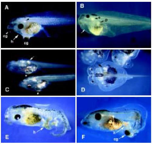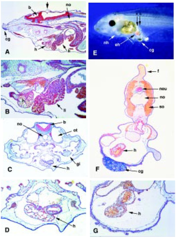 arrow a) cg, cement gland; b, brain; no, notochord; nh, normal heart; eh,