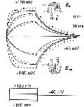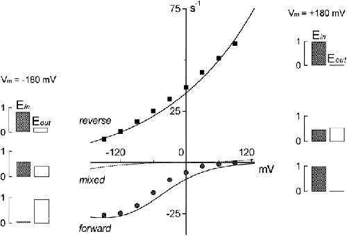 Figure 10. Simulated and measured GAT1 charge movements. The simulation is calibrated as elementary charges (e) moved through membrane field per single transporter. The experimental results are with 40 mM extracellular NaCl; the simulation is with 80 mM extracellular NaCl. As indicated by the cartoons, binding sites are expected to be open to the cytoplasmic side at positive potentials and to the extracellular side at negative potentials. See text for more explanations. |
