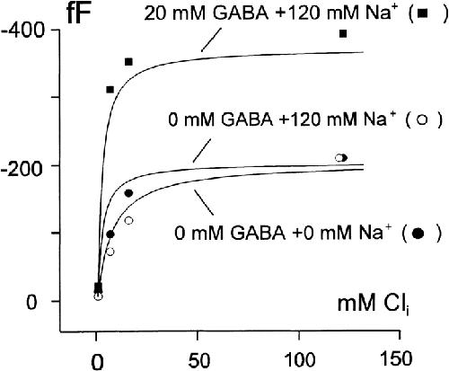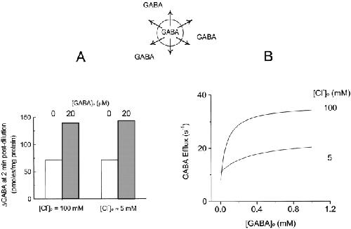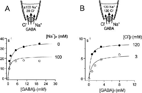 Figure 4. (A) GABA dependence of the outward transport current at 0 mV in the presence of 120 mM cytoplasmic Cl−, with and without 120 mM extracellular Na+. See text for details. (B) GABA dependence of the outward transport current at 0 mV in the presence of 120 mM extracellular NaCl, with 120 and 3 mM cytoplasmic Cl−. |
