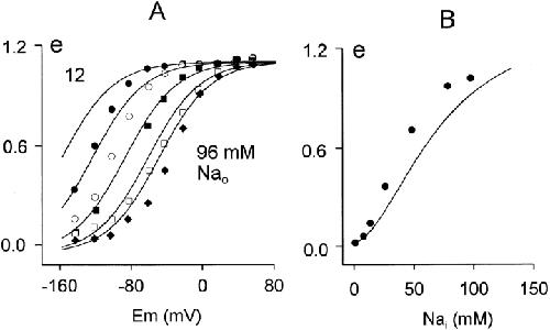 Figure 14. Voltage and extracellular Na+ dependence of GAT1 charge movements in whole-oocyte voltage clamp. The simulations are calibrated as elementary charges (e) moved through membrane field per single transporter. The results are from Mager et al. 1996. (A) Voltage dependence of charge moved at 96 (♦), 77 (□), 48 (▪), 24 (○), and 12 (•) mM extracellular Na+. (B) Na+i dependence of charge moved at −80 mV by application of 96 mM extracellular Na+. |