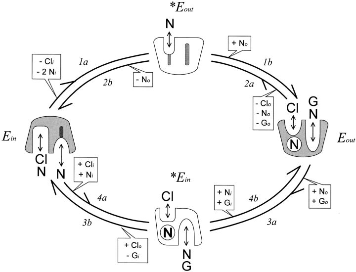 Figure 1. GAT1 cotransport model. The transporter cartoons are all oriented with the extracellular side facing upward. Substrate dependencies of each reaction are indicated in a box. (−) A reaction can occur only when the given substrate is not bound; (+) a reaction can occur only when the given substrate is bound. The model assumes the existence of two stable GAT1 states (Ein and Eout) and two transitional GAT1 states (*Ein and *Eout). In the Ein state, one Cl− (Cl) and two Na+ (N) can bind sequentially from the cytoplasmic side. When Ein binding sites are empty, a Na+ binding site can open to the extracellular side to form the *Eout state. One extracellular Na+ ion can be bound in the *Eout state and occluded into the transporter, thereby forming the Eout state. The Eout state can bind sequentially one Na+, one Cl−, and one GABA (G). When the Eout binding sites are fully occupied, a transition to the *Ein state can occur in which GABA and one Na+ can dissociate to the cytoplasmic side. Further opening of binding sites returns transporters to the Ein state. Conformational changes of the transitional states (1b, 2b, 3b, and 4b) are assumed to take place at infinite rates. See text for further details. |