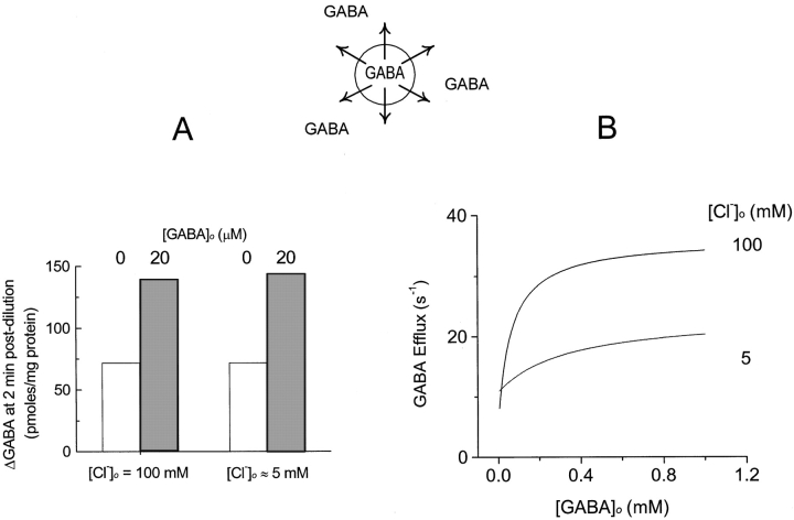 Figure 5. Measured and predicted characteristics of GABAo-stimulated GABA efflux. (A) GABA efflux from outside-out synaptic vesicles (Kanner et al. 1983). Vesicles were loaded with GAT1 substrates by forward transport. GABA efflux was monitored as loss of labeled GABA from the vesicles after diluting them into solutions containing Na+. Extracellular GABA (20 μM) stimulates GABA efflux by about twofold in the presence of 100 mM Cl−o, as well as in its nominal absence (<5 mM). Stimulation of GABA efflux by GABAo required the presence of extracellular Na+. (B) Model predictions: extracellular GABA dependence of GABA efflux in the presence of 40 mM cytoplasmic NaCl, 20 mM cytoplasmic GABA, and 100 mM extracellular Na+ (0 mV). GABA efflux is increased about fourfold by GABAo in the presence of 100 mM Cl−o, and by about twofold in the presence of 5 mM Cl−o. |