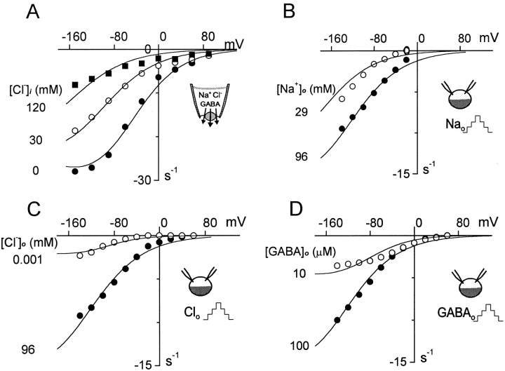 Figure 9. Current–voltage relations of the inward GAT1 current. (A) Inward GAT1 current in a giant patch with 0, 30, and 120 mM cytoplasmic Cl−. Results in B–D are whole-oocyte experiments (Mager et al. 1993), and the corresponding simulations assume 25 mM cytoplasmic Cl− and 12 mM cytoplasmic Na+. (B) Inward current with 96 and 29 mM extracellular Na+. (C) Inward current with 96 mM and nominally zero extracellular Cl−; the simulation is with 1 μM Cl−. (D) Inward current with 100 and 10 μM extracellular GABA. See text for further details. |