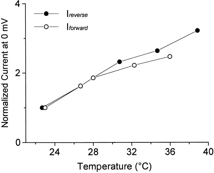 Figure 12. Temperature dependence of inward and outward GAT1 currents at 0 mV in excised oocyte patches. Inward current was recorded with 120 mM NaCl and 0.2 mM GABA on the extracellular side. Outward current was recorded with 120 mM NaCl and 20 mM GABA on the cytoplasmic side. |
