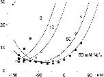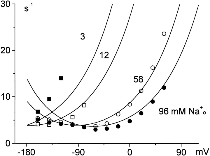 Figure 13. Voltage dependence of charge-movement rates in whole-oocyte voltage clamp with 96, 58, 12, and 3 mM extracellular Na+. The results are from Mager et al. 1996. See text for details. |