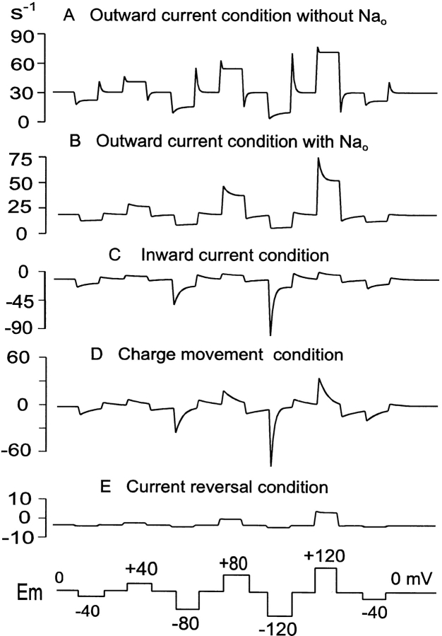 Figure 15. Predicted GAT1 pre–steady state current transients. The voltage protocol is given below the figure. These model results are comparable to experimental results described previously (Lu and Hilgemann 1999b). (A) Outward current condition without extracellular Na+: 120 mM cytoplasmic NaCl, 20 mM cytoplasmic GABA, and 20 mM extracellular Cl−. (B) Outward current condition as in A with additional 120 mM extracellular Na+. (C) Inward current condition: 120 mM extracellular NaCl, 0.2 mM extracellular GABA, and no cytoplasmic substrates. (D) Charge movement condition: 120 mM extracellular NaCl and no other GAT1 substrates. (E) Current reversal condition: 120 mM NaCl and 2 mM GABA on the extracellular side; 120 mM Na+, 6 mM Cl−, and 2 mM GABA on the cytoplasmic side. See text for complete details. |