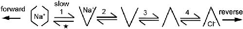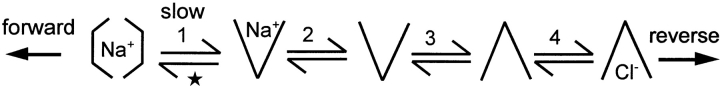 To explain cotransport function, the "alternating access" model requires that conformational changes of the empty transporter allow substrates to bind alternatively on opposite membrane sides. To test this principle for the GAT1 (GABA:Na+:Cl-) cotransporter, we have analyzed how its charge-moving partial reactions depend on substrates on both membrane sides in giant Xenopus oocyte membrane patches. (a) "Slow" charge movements, which require extracellular Na+ and probably reflect occlusion of Na+ by GAT1, were defined in three ways with similar results: by application of the high-affinity GAT1 blocker (NO-711), by application of a high concentration (120 mM) of cytoplasmic Cl-, and by removal of extracellular Na+ via pipette perfusion. (b) Three results indicate that cytoplasmic Cl- and extracellular Na+ bind to the transporter in a mutually exclusive fashion: first, cytoplasmic Cl- (5-140 mM) shifts the voltage dependence of the slow charge movement to more negative potentials, specifically by slowing its "forward" rate (i.e., extracellular Na+ occlusion); second, rapid application of cytoplasmic Cl- induces an outward current transient that requires extracellular Na+, consistent with extracellular Na+ being forced out of its binding site; third, fast charge-moving reactions, which can be monitored as a capacitance, are "immobilized" both by cytoplasmic Cl- binding and by extracellular Na+ occlusion (i.e., by the slow charge movement). (c) In the absence of extracellular Na+, three fast (submillisecond) charge movements have been identified, but no slow components. The addition of cytoplasmic Cl- suppresses two components (tau < 1 ms and 13 micros) and enables a faster component (tau < 1 micros). (d) We failed to identify charge movements of fully loaded GAT1 transporters (i.e., with all substrates on both sides). (e) Under zero-trans conditions, inward (forward) GAT1 current shows pronounced pre-steady state transients, while outward (reverse) GAT1 current does not. (f) Turnover rates for reverse GAT1 transport (33 degrees C), calculated from the ratio of steady state current magnitude to total charge movement magnitude, can exceed 60 s(-1) at positive potentials.