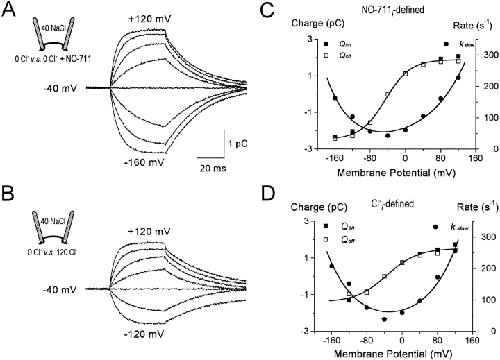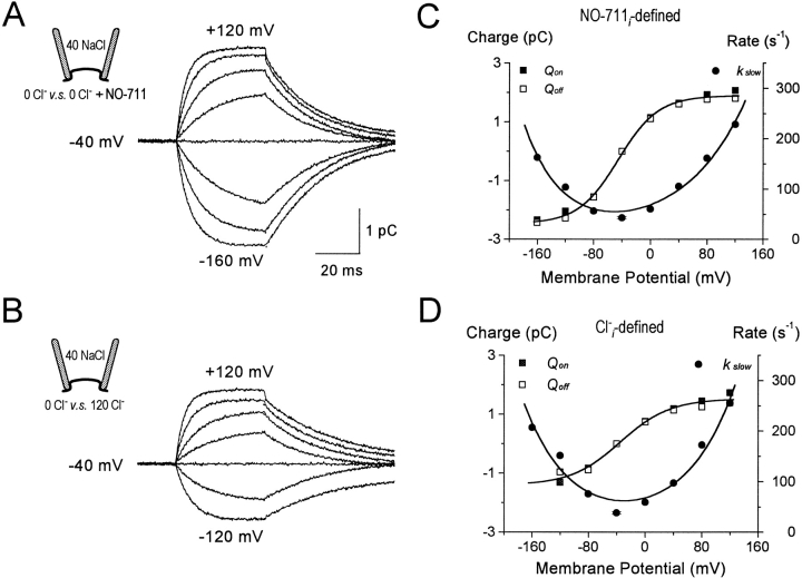 Figure 1. Slow GAT1 charge movements, Qslow, in an excised oocyte patch. (A and B) Charge transfer, the time integral of membrane current, was recorded directly from an integrating patch-clamp amplifier. The signals presented are records with no cytoplasmic substrates, from which records with 0.13 mM cytoplasmic NO-711 (A) or with 120 mM cytoplasmic Cl− (B) were subtracted. Extracellular [Na+] and [Cl−] were both 40 mM. Holding potential was −40 mV; 60-ms voltage pulses to voltages between −160 and +120 mV were applied in 40-mV steps. The record at the holding potential was fitted by a straight line, representing a background current of ∼1 pA, and this baseline was subtracted from all records in the same pulse series. Dotted lines, barely visible outside of signal noise, plot the best fit of each record by a single exponential function during pulse to various potentials (Qon) and 0.6 ms after returning to −40 mV (Qoff). (C and D) The charge magnitudes (Qon and Qoff) and rate constants (kslow) from the exponential fits are plotted against membrane potential: ▪, Qon; □, Qoff; •, kslow. The Q–V and kslow–V relations in C correspond to the inhibitor-defined charge movements (A), and those in D correspond to the Cl−i-defined records (B). Values at −40 mV are the mean for all the relaxation curves; standard error was within the symbol size. The voltage dependencies of Qon and Qoff were fitted by the Boltzmann relation, ΔQV=ΔQmax1+eV12−V·q·FR·T,where ΔQmax = Qmax − Qmin, V1/2 is the potential where ΔQ(V) = ΔQmax/2, q is the equivalent charge moved; F, R, and T have their usual meanings. At 33°C, the fitted parameters are (C) V1/2 = −45 mV, q = 0.94, Qmin = −2.47, Qmax = 1.89; and (D) V1/2 = −35 mV, q = 0.76, Qmin = −1.41, Qmax = 1.52. The kslow–V relations were fitted by the sum of two single exponentials kslowV=A1·exp−V·q1·FR·T+A2·expV·q2·FR·T: (C) q1 = 0.49 and q2 = 0.30, and (D) q1 = 0.39 and q2 = 0.36.