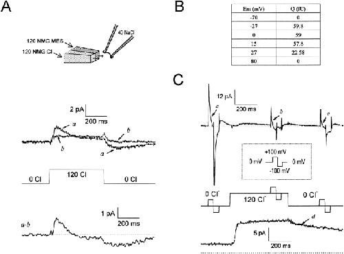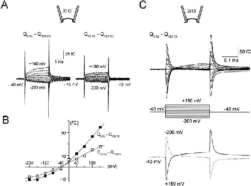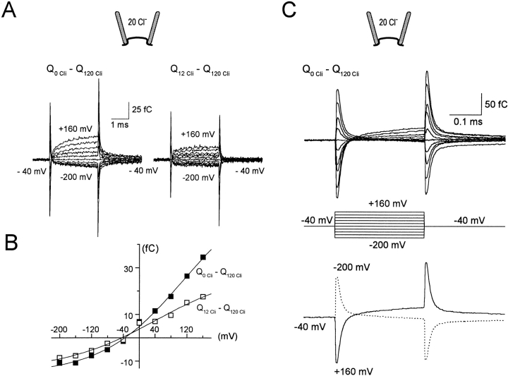 Figure 6. Multiple components of fast Cl−i-dependent GAT1 charge movements (no cytoplasmic Na+ or GABA). (A) Superimposed records of GAT1 charge movements elicited by a series of 2.7-ms pulses in 40-mV increments. The holding potential was −40 mV. Records in the presence of 120 mM cytoplasmic Cl− are subtracted from those in the absence (left) and presence (right) of 12 mM cytoplasmic Cl−. The extracellular solution contained 20 mM Cl− and no Na+. (B) The charge magnitude at the end of each voltage pulse in A is plotted against membrane voltage. (C, top) Fast Cl−i-defined charge movements resolved during 0.27-ms voltage pulses. Records shown are subtractions of records with and without 120 mM cytoplasmic Cl−. (Bottom) Traces from the top panel to +160 mV (solid line) and −200 mV (dotted line).