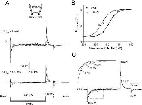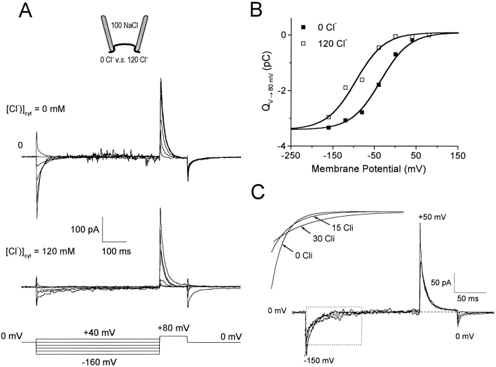 Figure 2. Negative shift and slowing of Qslow by cytoplasmic Cl−. (A) GAT1 current transients elicited by an 80-ms test pulse to +80 mV after 360-ms prepulses applied in 40-mV increments from −160 to +40 mV (no cytoplasmic GABA or Na+; 100 mM extracellular NaCl). The top traces are without and the bottom traces are with 120 mM cytoplasmic Cl−. (B) Charge movement magnitudes, determined from the current traces at +80 mV, are plotted in the absence (▪) and presence (□) of 120 mM cytoplasmic Cl− (100 mM extracellular NaCl). The solid curves are fits of Boltzmann functions to the data (see Fig. 1, legend), whereby the midpoints are −36 and −96 mV in the absence and presence of 120 mM cytoplasmic Cl−, respectively. See text for details. (C) GAT1 current transients in 0, 15, and 30 mM cytoplasmic Cl− were elicited by a 180-ms pulse to −150 mV from the holding potential of 0 mV, followed by a 60-ms pulse to +50 mV (no cytoplasmic Na+ or GABA; 120 mM extracellular NaCl). The current transients at −150 mV were fitted by single exponentials (dashed lines and inset). The time constants are 12.1, 18.9, and 36.6 ms with 0, 15, and 30 mM cytoplasmic Cl−, respectively.
