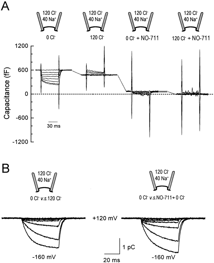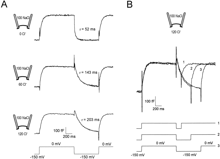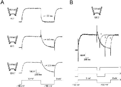 Figure 4. Linkage of slow and fast charge movements revealed by capacitance measurements. (A) GAT1 capacitance was measured with 0, 60, and 120 mM cytoplasmic Cl− and 100 mM extracellular NaCl (no cytoplasmic Na+ or GABA). The patch was prepulsed from the holding potential of 0 to −150 mV for 1 s (not shown) before applying the voltage pulse shown at bottom. The capacitance records at −150 mV were fitted by single exponentials (dotted lines), and the time constant at each Cl−i concentration is given to the right of each trace. (B) Superimposed GAT1 capacitance records with 120 mM cytoplasmic Cl− and 100 mM extracellular NaCl. Same prepulse and holding potential as in A. In both A and B, the capacitance was measured with a 1-mV, 20-kHz sinusoidal perturbation.