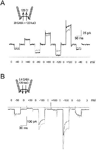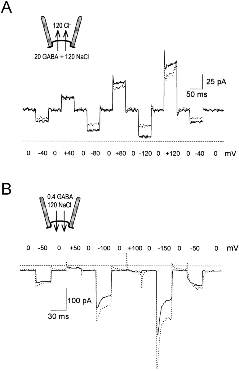 Figure 7. Current transients during forward and reverse GAT1 transport. (A) Outward GAT1 transport currents with 120 mM cytoplasmic NaCl, 120 mM extracellular Cl−, and no extracellular Na+. The solid line shows current activated by 20 mM cytoplasmic GABA, and the dotted line shows NO-711i–defined current. (B) Inward GAT1 transport current with 0.4 mM extracellular GABA and 120 mM extracellular NaCl. Current records in the presence of 120 mM cytoplasmic Cl−(solid line) or 0.13 mM cytoplasmic NO-711 (dotted line) were subtracted from those with zero cytoplasmic substrates and zero inhibitor. Dashed lines represent zero current. Holding potential was 0 mV.