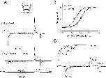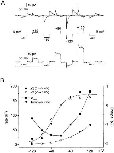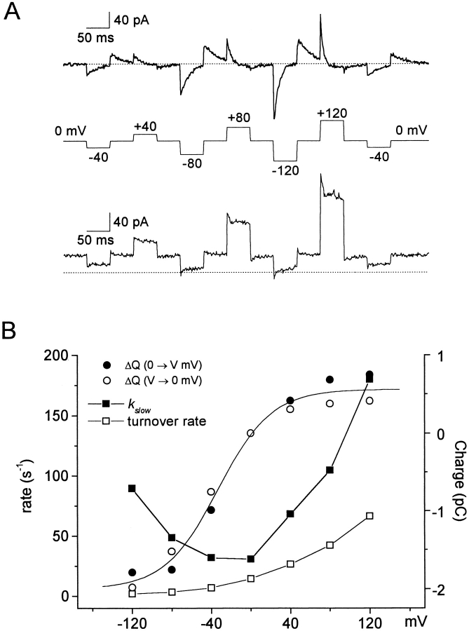 Figure 8. Estimation of GAT1 turnover rates from the slow charge movements and steady state current magnitudes. (A) The NO-711i–sensitive GAT1 transient (top) and steady state outward transport current (bottom) were recorded in the same patch in the presence of 120 mM extracellular NaCl. The current transients are a subtraction of records with no cytoplasmic substrates (no inhibitor record minus 0.13 mM cytoplasmic NO-711 record). Steady state GAT1 transport current (bottom) is with 20 mM cytoplasmic GABA and 120 mM cytoplasmic NaCl (no inhibitor record minus 0.13 mM NO-711 record). Dashed lines under the current trace represents zero current. Holding potential was 0 mV. (B) Voltage dependence of charge movement (○ and •), rate constants of the slow charge (▪), and turnover rates (□). The magnitude and rate of charge movement in A were estimated from extrapolation of the exponential current decay for pulses to (•) and from (○) various voltages. The fit of the Q–V relation by a Boltzmann function (smooth line) gives a midpoint voltage of −33.1 mV, a slope of 0.99, and a total charge of 2.6 pC. The turnover rates were calculated as the quotient of steady state transport current and total charge moved, assuming that one elementary charge moves per transport cycle.
