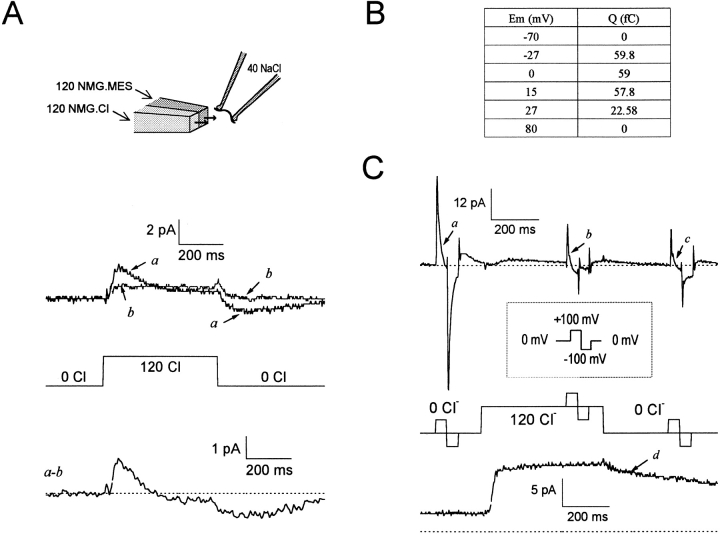 Figure 3. Linkage of cytoplasmic Cl− binding to slow GAT1 charge movements. In the presence of 40 mM extracellular Na+, current transients are elicited by stepping [Cl−]i from 0 to 120 mM and back to 0 mM. (A, top) Current traces before (a) and after (b) adding 0.13 mM cytoplasmic NO-711 (no cytoplasmic GABA or Na+). (Bottom) The inhibitor-defined current transient (a–b). (B) Current transients, as in A, were monitored at various membrane potentials. The magnitude of Cl−i-linked charge movement was calculated as the area bounded by the zero-current line and the outward-current transient. Note that charge movement is absent at the extreme potentials. (C, top) NO-711i-defined membrane current in response to combined Cl−i concentration jumps and voltage jumps (no cytoplasmic GABA or Na+). (Bottom) In the same patch, GAT1 transport current was turned on and off by applying and removing 120 mM cytoplasmic Cl− in the presence of 20 mM cytoplasmic GABA and 120 mM cytoplasmic Na+. Dashed lines in A and C represent zero current.