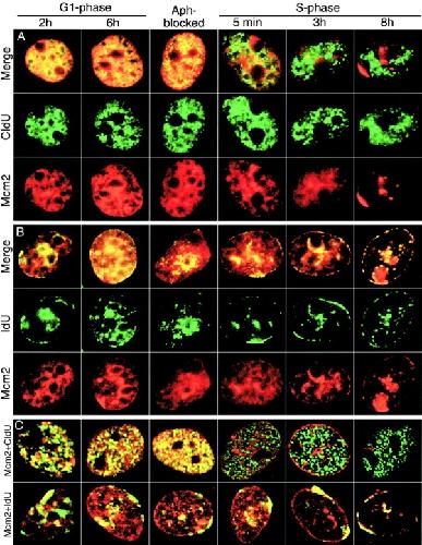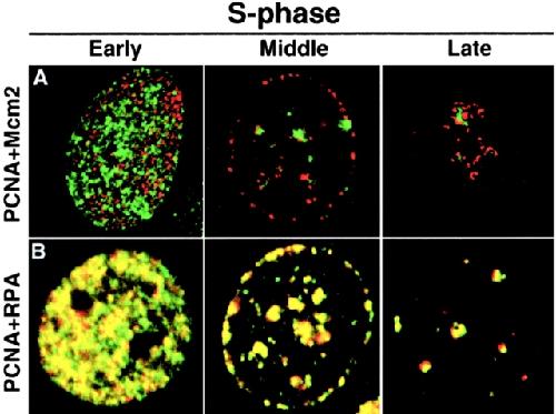 Figure 4. RPA, but not Mcm2, is present at PCNA-containing active mammalian replication forks. Aliquots of the cell cultures (synchronized in early or mid/late S-phase) used in Fig. 2 were immunostained with PCNA-specific (red) and, either Mcm2-specific (A, green), or RPA-specific (B, green) antibodies. Shown are single sections obtained by dual-color confocal laser scanning microscopy.