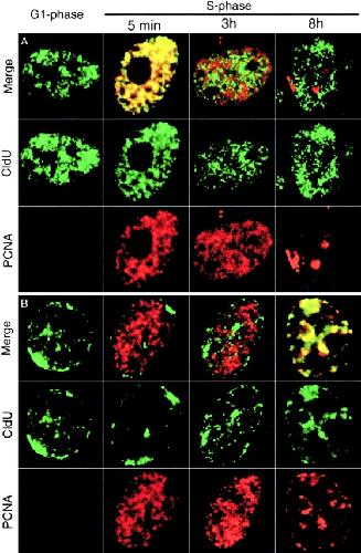 Figure 3. PCNA does not bind nuclear components during G1-phase and associates transiently with chromosomal domains at the time when they replicate. (A) The association of PCNA (red) with the earliest-replicating chromatin regions (CldU-tagged, green) was examined in aliquots of the cells used in the experiment displayed in Fig. 2. (B) Late-replicating genomic regions were pulse-labeled with CldU (green) at 8 h in S-phase in a parallel culture of CHOC 400 cells, mitotic cells were collected few hours later, released in the subsequent cell cycle for the same periods of time and processed in the same way as in Fig. 2.