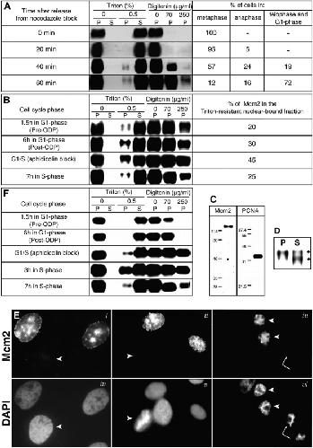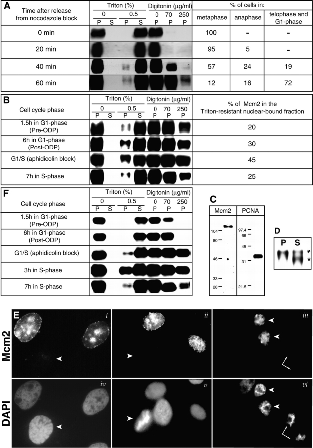 Figure 5. Variations in the amount of chromatin-bound Mcm2 and PCNA during different stages of the cell cycle in CHOC 400 cells. Synchronized cell populations were resuspended in cytoskeleton buffer (for Triton extractions) or transport buffer (for digitonin extractions) and incubated for 5 min on ice with or without addition of permeabilizing agents as described in Materials and Methods. The cellular or nuclear pellets (P) were separated from the soluble fractions (S) by centrifugation. The proteins from each fraction (only the pellets were analyzed in the case of digitonin extractions) were separated by electrophoresis in 10% (A, B, C-Mcm2, and D) or 18% (C, PCNA) SDS–polyacrylamide gels (amounts corresponding to 2 × 105 cells were loaded in each lane), transferred to nylon membranes and probed with an anti-Mcm2 antibody (A–D) or anti-PCNA antibody (C, PCNA and F). (A) Immunoblotting analysis of chromatin-bound Mcm2 at 20, 40, and 60 min after release of CHOC 400 cells from metaphase block. The percentages of cells in different stages of mitosis, determined microscopically after staining aliquots of the synchronized cells with 0.1 μg/ml 4′,6-diamidino-2-phenylindole (DAPI), are indicated on the right for each time point. (B) Immunoblot analysis of chromatin-bound Mcm2 at different times during interphase. The permeabilization of cells with 70 μg/ml digitonin produces nuclei with intact membranes and can be used as a reference for the total amount of nuclear Mcm2 proteins. The relative amounts of chromatin-bound Mcm2 proteins at each time point analyzed were estimated by comparing serial dilutions of the soluble fractions run in parallel to an aliquot of the Triton-resistant fraction and are indicated on the right. (C) Western blots of total CHOC400 cellular protein extract probed with anti-Mcm2 or anti-PCNA antibodies. Positions of molecular mass standards (indicated in kD) are marked on the left of each blot. (D) Hamster Mcm2, like human BM28/Mcm2 (Todorov et al. 1995), exists as different isoforms. A lighter exposure of immunoblots probed with Mcm2-specific antibodies reveals that Mcm2 proteins can be resolved as a doublet of bands (marked with stars) in the soluble protein fraction. Only a slow moving form is detected in the nuclear pellet fraction. (E) Immunofluorescent analysis of Mcm2 chromatin-binding in Triton-extracted CHOC 400 cells at different stages of mitosis. Asynchronous cells grown on coverslips were extracted with 0.5% Triton in CSK buffer for 2 min on ice, fixed with formaldehyde, and immunostained for Mcm2 as in Fig. 2. DNA was stained with DAPI as in A. The arrowheads point to cells in prophase (i) and (iv), metaphase (ii) and (v), and late telophase (iii) and (vi). The arrows point to a cell in late anaphase/early telophase (iii) and (vi). (F) Immunoblot analysis of chromatin-bound PCNA at different times during interphase. The same protein blots used in B were probed with a PCNA-specific antibody. An increase in the total amount of cellular PCNA at the beginning of S-phase is evident, consistent with previously reported data on human PCNA (Morris and Mathews 1989). The level of chromatin-bound PCNA increased after release into S-phase and maximal amount of insoluble PCNA was detected during early S-phase.