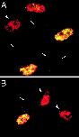 Figure 8. Hamster RPA and PCNA are assembled into detergent-resistant replicative complexes within less than an hour from the start of S-phase. CHOC 400 cells, synchronized in mitosis, were released for 8 h in the following cell cycle (20% of the cells had entered S-phase at this time). The cells were pulse-labeled with 100 μM CldU for 1 min, extracted with Triton and fixed with formaldehyde as described in Materials and Methods. Aliquots of the cells were stained with anti-CldU antibodies (green) and either anti-RPA antibodies (red, A) or anti-PCNA antibodies (red, B). S-phase cells display yellow coloration resulting from the colocalization of RPA or PCNA (red) with nascent DNA (CldU, green). Arrowheads point to nuclei that exhibit positive staining for RPA or PCNA, but no CldU label. Arrows indicate the positions of G1-phase cells (barely visible as faint shadows).