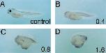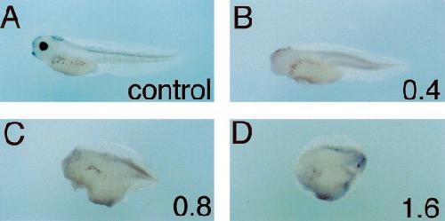 Fig. 5. Xvex-1 ventralizes Xenopus embryos. Embryos injected with increasing amounts of Xvex-1 mRNA exhibit dose dependent ventralization. At the four-cell stage, embryos were injected in all four blastomeres with the appropriate RNA. (A) Control, LacZ mRNA injected embryo. (B) Embryo injected with 0.4 ng of Xvex-1 mRNA. (C) Injection of 0.8 ng of sense Xvex-1 RNA result in further ventralization. (D) Embryos injected with 1.6 ng of Xvex-1 mRNA exhibit the strongest degree of ventralization.