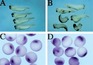Fig. 6. Partial loss-of-function of Xvex-1 has dorsalizing effects. Embryos were injected with antisense Xvex-1 RNA in all four blastomeres at the four-cell stage. Embryos were processed for phenotypic analysis (A,B) or for the analysis of the effects on gene expression (C,D). Phenotypic analysis was performed at stage 37/38 (A) control embryos, (B) antisense Xvex-1 RNA injected embryos exhibiting dorsalization and secondary axis induction (red arrowheads). The gsc gene was used as a marker to study the effect of partial loss of Xvex-1 function, (C) control embryos exhibiting the normal gsc expression at stage 10.5, (D) expanded gsc expression in embryos injected with antisense Xvex-1 RNA.