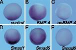Fig. 7. Regulation of Xvex-1 expression by BMP-4. In order to study the regulatory effect of BMP-4 on Xvex-1 expression RNA encoding different elements of the BMP-4 signaling pathway was injected in all four blastomeres of four-cell embryos. At stage 11 the embryos were processed for whole mount in situ hybridization and probed with the Xvex-1 specific probe. (A) Control embryo exhibiting normal Xvex-1 expression. (B) Embryo injected with BMP-4 mRNA exhibiting expanded expression of Xvex-1. (C) Injection of antisense BMP-4 RNA results in the downregulation of Xvex-1 expression. (D) Embryo injected with the BMP-specific Smad1 mRNA shows expansion in the domain of Xvex-1 expression. (E) Overexpression of Smad5 also results in the upregulation of Xvex-1 expression and its dorsal expansion. (F) Embryo injected with the BMP-specific inhibitory Smad6 results in the downregulation of Xvex-1 expression.