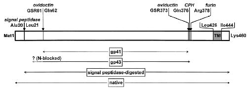 gp43 is first digested at Arg378 (double underline) with a Xenopus