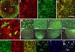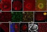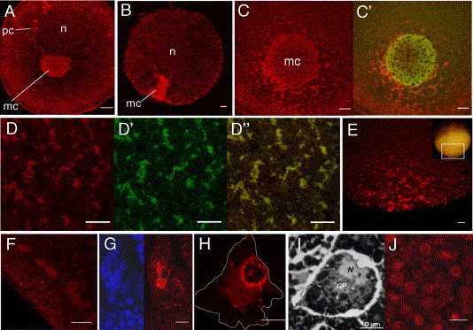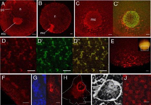 Fig. 2. Xpat protein (red) is a constituent of germ plasm. (A) Anti-Xpat heavily stains particles concentrated in the mitochondrial cloud (mc) of a stage I oocyte, and pre-clouds (pc) around the nucleus (n). (B, C) At stage II, Xpat is still focused in the mitochondrial cloud, along with endogenous Xpat mRNA, detected by injecting fluorescent antisense Xpat (green, overlay, C′). This oocyte is viewed looking in from the point where the mitochondrial cloud touches the cortex. (D) Germ plasm islands in the vegetal cortex of a stage VI oocyte, detected by anti-Xpat (D), mitochondrial anti-VDAC (D′, overlay in Dʺ). (E) Field of germ plasm islands at the vegetal pole (see inset of the unfertilised egg). (F) Islands at the 2-cell stage, shown in transverse optical section. (G) A PGC deep in the endoderm of a stage 28 embryo, also stained with DAPI (left, blue). (H) A PGC, immunostained for Xpat, and the cellular outline drawn in grey, demonstrates similarity to a conventionally stained PGC in the tailbud embryo (I), from Kamimura et al. (1980). (J) Nuclei in epidermal cells of tailbud embryos also contain Xpat. Scale bars, 20 μm. |