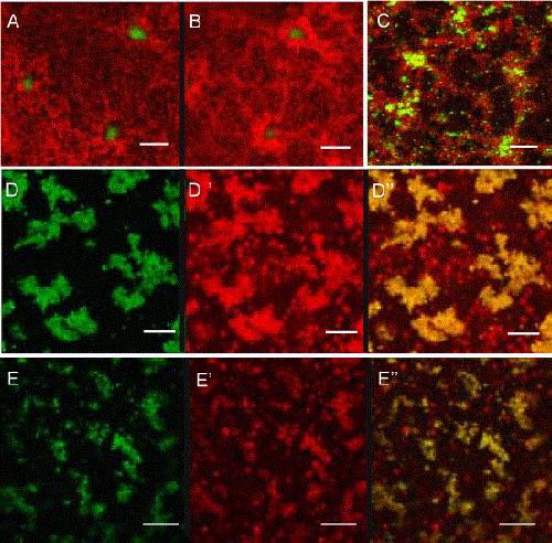 Fig. 5. Xpat-GFP recruits mitochondria. Xpat-GFP is shown in green and mitochondria by staining with TMRE (red) after 2 days incubation. (A, B) Xpat-GFP aggregates in the vegetal hemisphere drew in mitochondria from deeper layers, shown in two optical sections of living oocytes 1.6 μm apart. (C) Anti-VDAC staining (red) of fixed Xpat-GFP-expressing oocytes confirmed this result. (D) In some cases, mitochondria (D′) became integrated into the Xpat-GFP aggregates (D; overlay Dʺ). (E) The same is seen in aggregates formed in the animal hemisphere, after animal mRNA injection and omitting vitellogenin. Scale bars, 20 μm, A–C; 10 μm, D–E. |