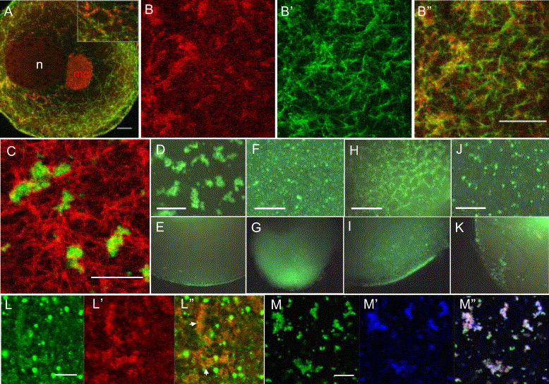 Fig. 6. Microtubule-based transport of Xpat. (A) In stage I oocytes, Xpat particles (Anti-Xpat, red) are closely associated with microtubules (green), here shown by immunofluorescence. (BâBâ² and Bʺ) Xpat germ plasm islands in stage VI oocytes (red) are in dense areas of microtubules (green, overlay Bâ² and Bʺ), as are Xpat-GFP aggregates (C, Xpat-GFP green, microtubules in red). (DâK) Effects of inhibitors on Xpat-GFP. In control oocytes, Xpat-GFP forms cortical particles at the equator by 18 h after mRNA injection (see Fig. 3D). (D, E) These Xpat-GFP particles have formed aggregates at the vegetal cortex by 55 h. (F, G) Nocodazole interferes with vegetal localisation and aggregation, particularly to the cortex. (H, I) Taxol, which bundles microtubules, produces chains of particles all through the oocyte, largely in the cortex. (J, K) Microfilament disruption with cytochalasin D allows some cortical localisation, but the cortex appears to fragment and the particles form only small, disorganised aggregates, largely at the vegetal pole. (LâLʺ) Dynein, stained with an intermediate chain antibody (green) is present in intense local foci in the cortex and also as fine particles in germ plasm islands (arrows), identified with Xpat antibody (red). (Lʺ) Overlay. (MâMʺ) Xpat-GFP (green) co-localises with immunostained Dynein (blue). Overlay (Mʺ). 20 μm scale bars in confocal sections (AâC), 4 μm (L), 10 μm (M). 50 μm scale bars in surface views of oocytes (DâJ). Panels E, G, I and K are bisected oocytes, fixed at 80°C for 30 s; the control section is Fig. 3F. |