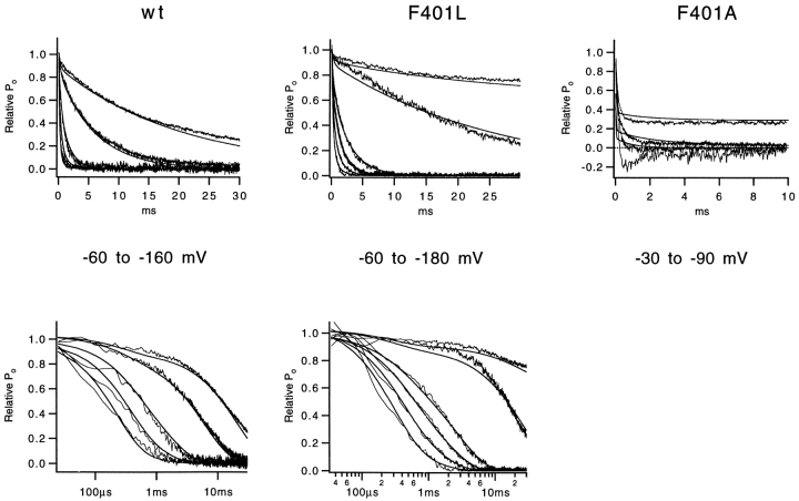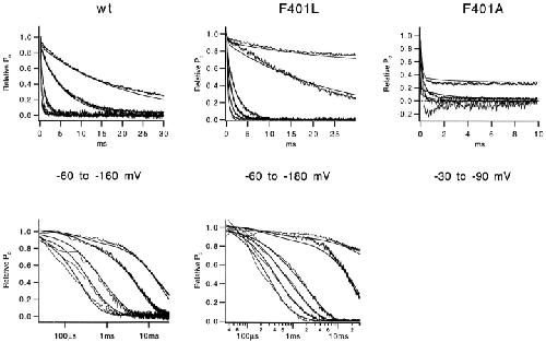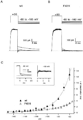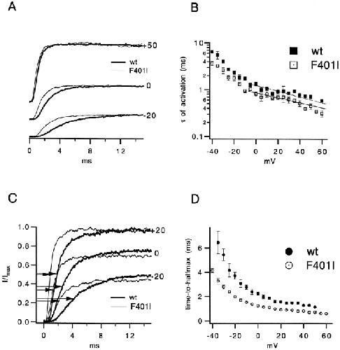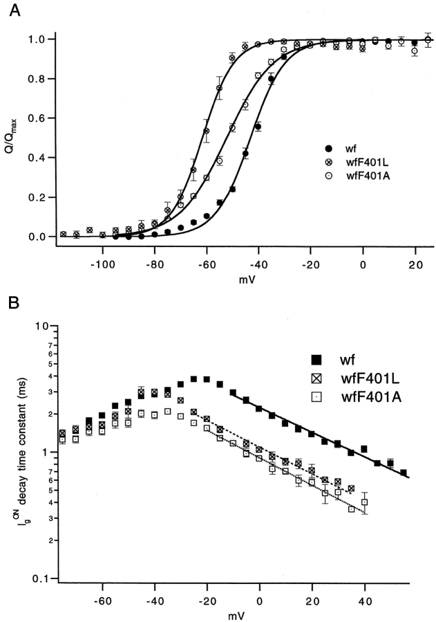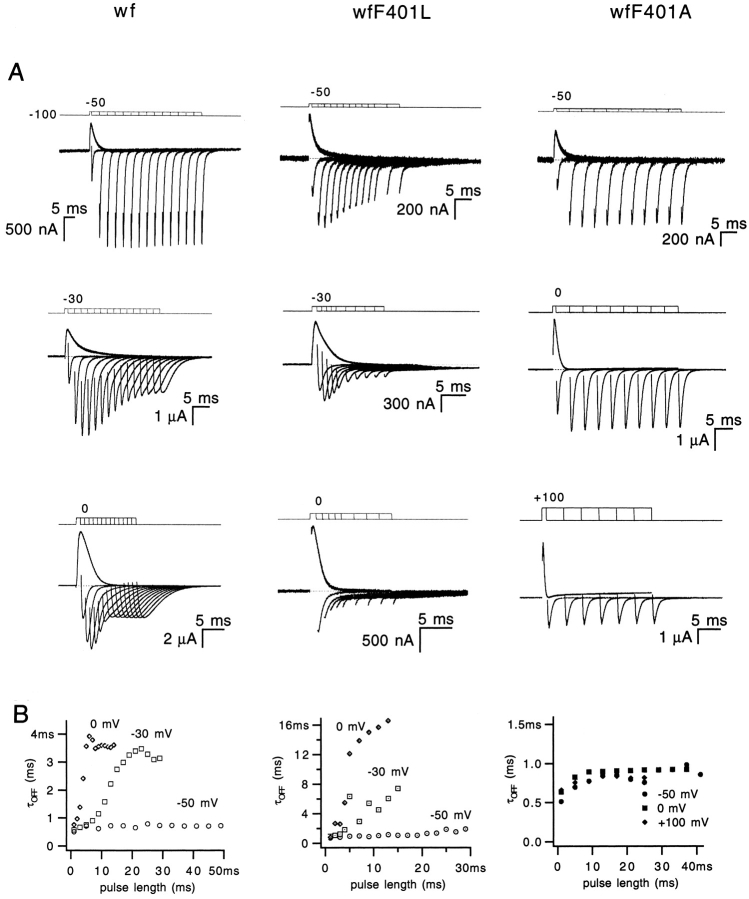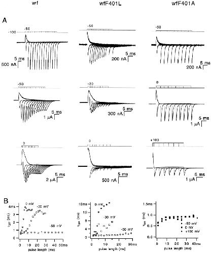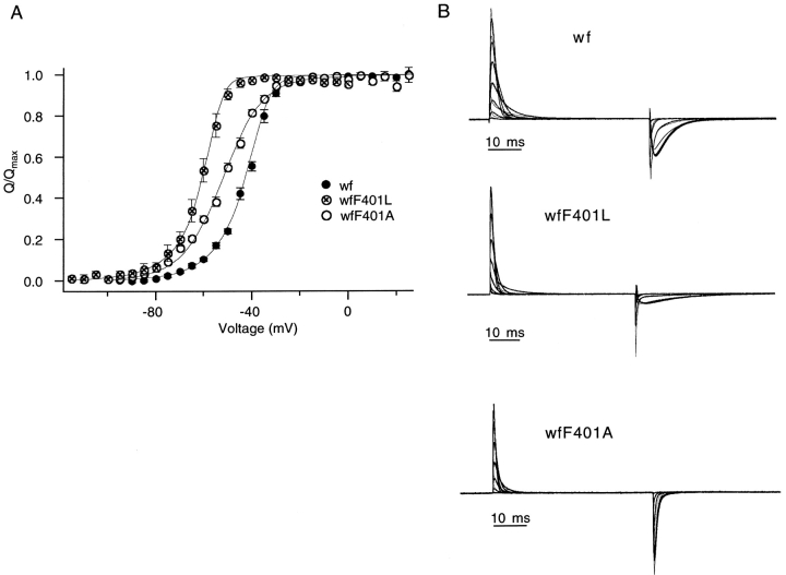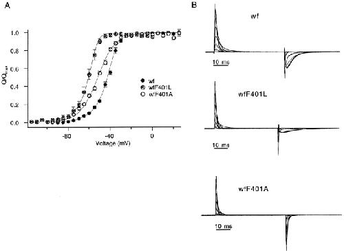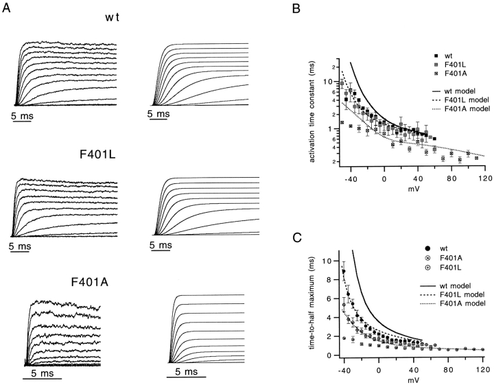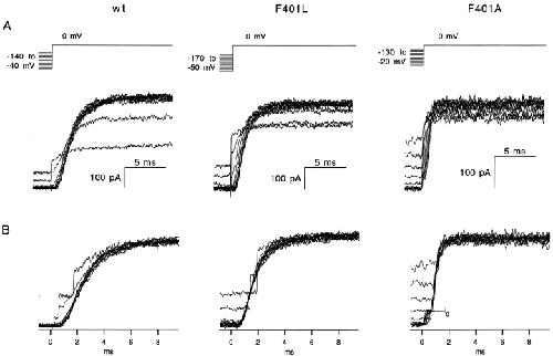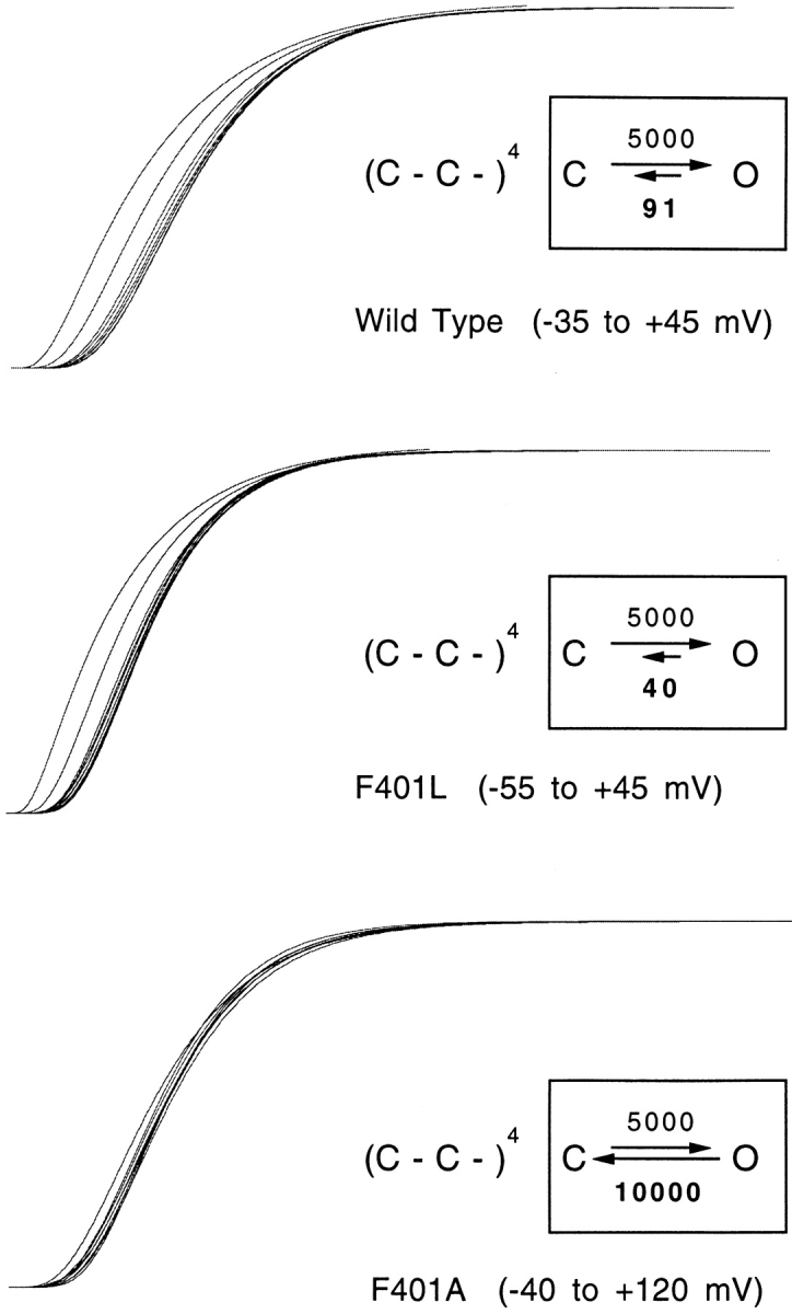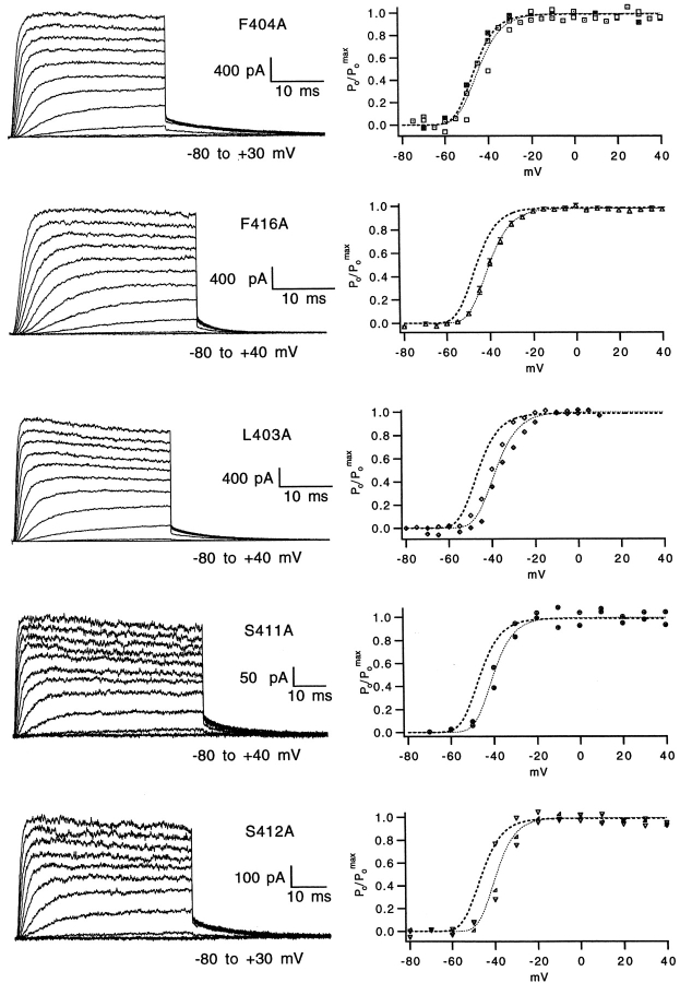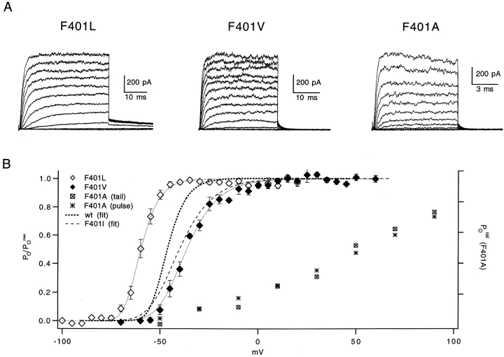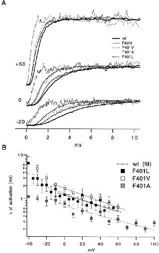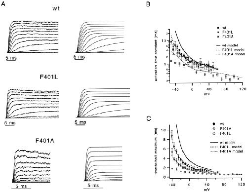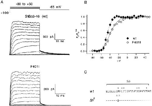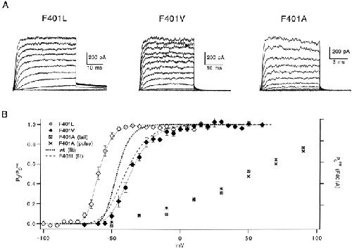The best-known Shaker allele of Drosophila with a novel gating phenotype, Sh(5), differs from the wild-type potassium channel by a point mutation in the fifth membrane-spanning segment (S5) (Gautam, M., and M.A. Tanouye. 1990. Neuron. 5:67-73; Lichtinghagen, R., M. Stocker, R. Wittka, G. Boheim, W. Stühmer, A. Ferrus, and O. Pongs. 1990. EMBO [Eur. Mol. Biol. Organ.] J. 9:4399-4407) and causes a decrease in the apparent voltage dependence of opening. A kinetic study of Sh(5) revealed that changes in the deactivation rate could account for the altered gating behavior (Zagotta, W.N., and R.W. Aldrich. 1990. J. Neurosci. 10:1799-1810), but the presence of intact fast inactivation precluded observation of the closing kinetics and steady state activation. We studied the Sh(5) mutation (F401I) in ShB channels in which fast N-type inactivation was removed, directly confirming this conclusion. Replacement of other phenylalanines in S5 did not result in substantial alterations in voltage-dependent gating. At position 401, valine and alanine substitutions, like F401I, produce currents with decreased apparent voltage dependence of the open probability and of the deactivation rates, as well as accelerated kinetics of opening and closing. A leucine residue is the exception among aliphatic mutants, with the F401L channels having a steep voltage dependence of opening and slow closing kinetics. The analysis of sigmoidal delay in channel opening, and of gating current kinetics, indicates that wild-type and F401L mutant channels possess a form of cooperativity in the gating mechanism that the F401A channels lack. The wild-type and F401L channels' entering the open state gives rise to slow decay of the OFF gating current. In F401A, rapid gating charge return persists after channels open, confirming that this mutation disrupts stabilization of the open state. We present a kinetic model that can account for these properties by postulating that the four subunits independently undergo two sequential voltage-sensitive transitions each, followed by a final concerted opening step. These channels differ primarily in the final concerted transition, which is biased in favor of the open state in F401L and the wild type, and in the opposite direction in F401A. These results are consistent with an activation scheme whereby bulky aromatic or aliphatic side chains at position 401 in S5 cooperatively stabilize the open state, possibly by interacting with residues in other helices.