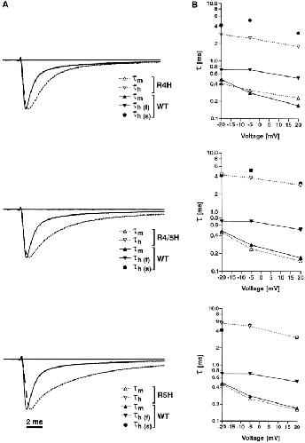 Figure 2. Effects of S4D4 point mutations on kinetics and on voltage dependence of macroscopic Na+ currents. (A) Comparison of normalized single current traces of WT (solid line) and mutant (dotted line) channels, elicited by a depolarizing pulse to −5 mV from a −100-mV holding potential. The settling times of the corresponding capacitance transients are almost identical (data not shown). (B) Semilogarithmic plots of single (mutants) or double (WT inactivation) exponential fits, as indicated, from representative current traces elicited by depolarizing pulses to −20, −5, and 20 mV; holding potential −100 mV. Single fits accord to the following equation. INa(t) = A * (1 − exp (−t/τm))3*exp(−t/τh) + P * (1 − exp(−t/τm))3. WT: (τm/τh (fast)/τh (slow) in ms) 0.48/0.70/4.20 (−20 mV); 0.28/0.70/5.10 (−5 mV); 0.17/0.51/3.10 (20 mV); R4H: (τm/τh in ms) 0.41/2.90 (−20 mV); 0.31/2.50 (−5 mV); 0.23/1.80 (20 mV); R4/5H: (τm/τh in ms) 0.45/4.30 (−20 mV); 0.24/3.80 (−5 mV); 0.15/2.90 (20 mV); R5H: (τm/τh in ms) 0.45/5.50 (−20 mV); 0.25/4.90 (−5 mV); 0.16/3.10 (20 mV). |