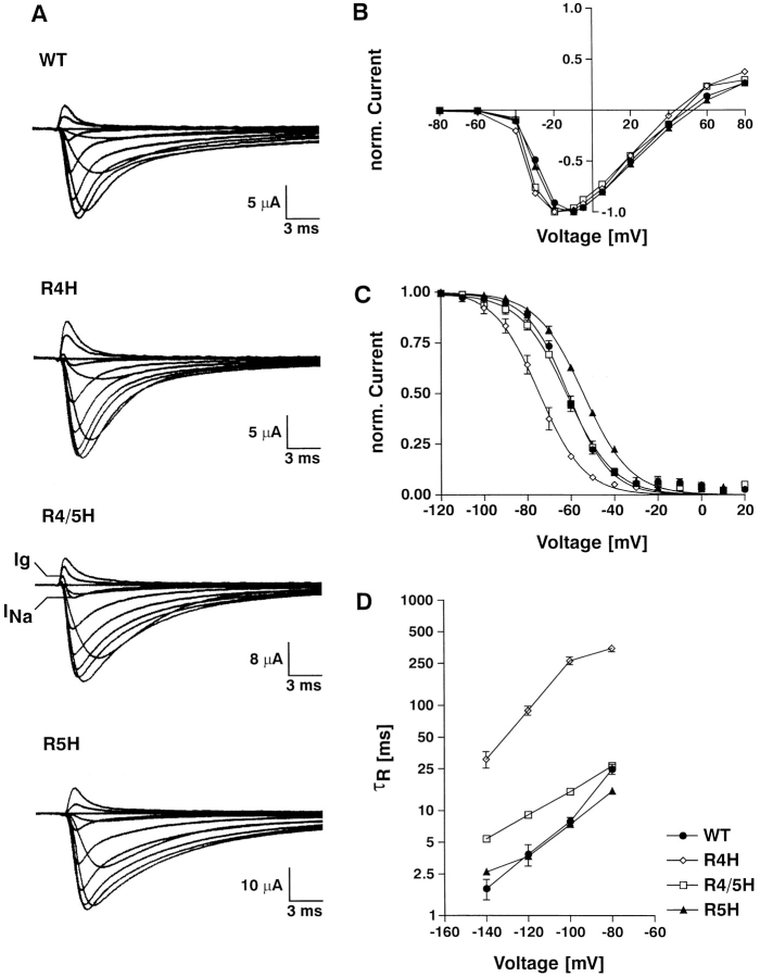 Figure 1. Effects of S4D4 point mutations on macroscopic Na+ currents. (A) Na+ currents from WT-, R4H-, R4/5H-, and R5H-injected Xenopus oocytes elicited by step depolarizations from −80 to 80 mV, holding potential −100 mV. A single trace displaying an outward gating current followed by an inward ionic current near sodium reversal potential is indicated in R4/5H. (B) Corresponding current–voltage relationship of peak Na+ currents, normalized to the largest inward current. (C) Steady-state inactivation at 0 mV induced by a 100-ms prepulse at voltages between −120 and 20 mV, increments of 10 mV, holding potential −100 mV. The curves are fitted to a standard Boltzmann distribution with slopes and V0.5 given in the text. Values are mean ± SEM of n > 3 cells. (D) Semilogarithmic plot of time constant and voltage of recovery from fast inactivation. Pulse protocol: a 80-ms test pulse to 0 mV was preceded by a 100-ms pulse to 0 mV and variable recovery periods at four different holding potentials (−80, −100, −120, and −140 mV). Values are mean recovery time constants in milliseconds ± SEM of n = 1–7 cells; WT, 1.8 ± 0.6 (−140 mV), 3.9 ± 1.8 (−120 mV), 7.9 ± 1.5 (−100 mV), 24.8 ± 6.0 (−80 mV); R4H, 30.8 ± 9.6 (−140 mV), 89.4 ± 19.3 (−120 mV), 264 ± 59 (−100 mV), 347 ± 55.1 (−80 mV); R4/5H, 5.4 ± 0.5 (−140 mV), 9.1 ± 0.9 (−120 mV), 15.1 ± 0.8 (−100 mV), 26.7 ± 1.8 (−80 mV); R5H, 2.6 (−140mV), 3.7 ± 0.2 (−120 mV), 7.4 ± 0.6 (−100 mV), 15.4 ± 0.9 (−80 mV). |