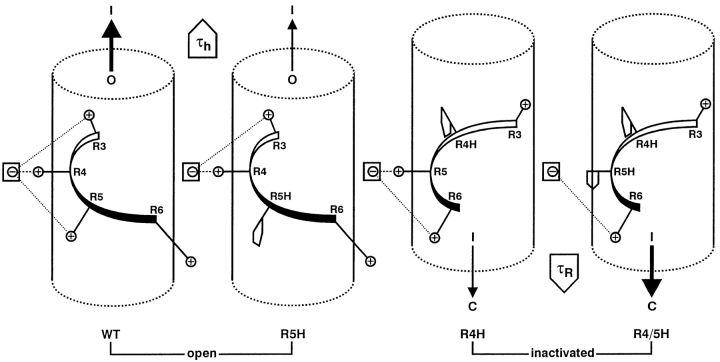 Figure 9. Scheme of possible interactions of the central arginines of S4D4 with a putative counter-charge that could explain the different inactivation behavior of the mutants. Illustrated is the central section of S4D4 containing the highly conserved central arginines R3–R6; the hypothetical negative counter-charge is indicated. WT and R5H are shown in the open state and R4H and R4/5H are shown in the inactivated state. Compared with WT, the O → I transition is considerably slowed in R5H (indicated by a thin arrow) and moderately slowed in R4H (not illustrated). This is due to the electrostatic asymmetry resulting from the interaction of the negative counter-charge with the neighbored arginines and histidines in the single mutants. On the other hand, the I2 → C2 transition (recovery from inactivation) is for the same reason drastically slowed in R4H (indicated by a thin arrow) and hardly affected in R5H (not illustrated). In contrast, WT and R4/5H display more symmetrical electrostatics, but due to the considerably altered structure in the double mutant, the mobility of S4D4 is slowed in both directions. |